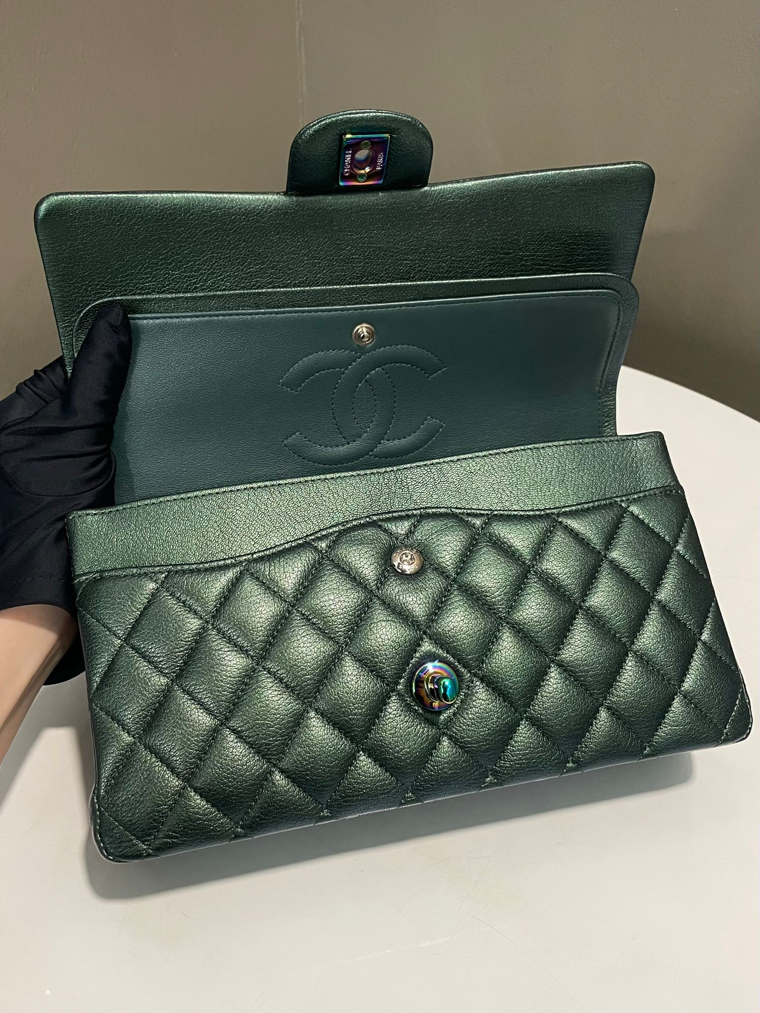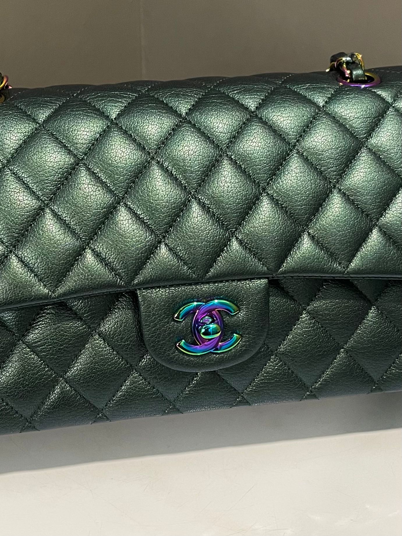 Chanel 16C Classic Quilted Medium Double Flap Emerald Iridescent Mermaid