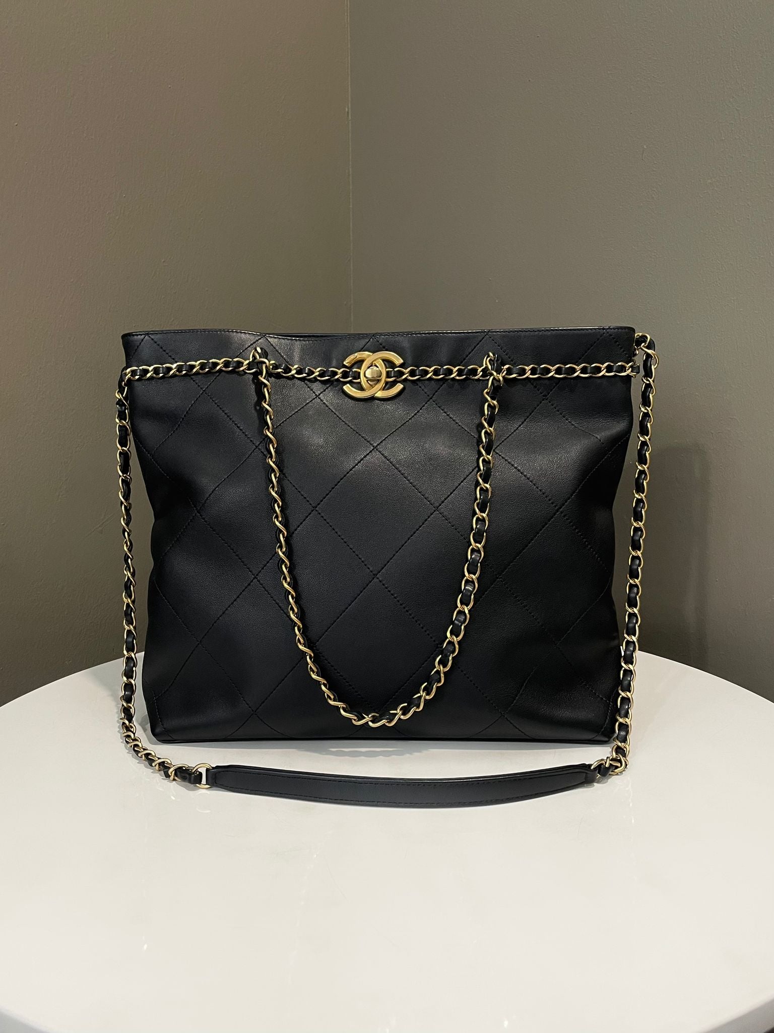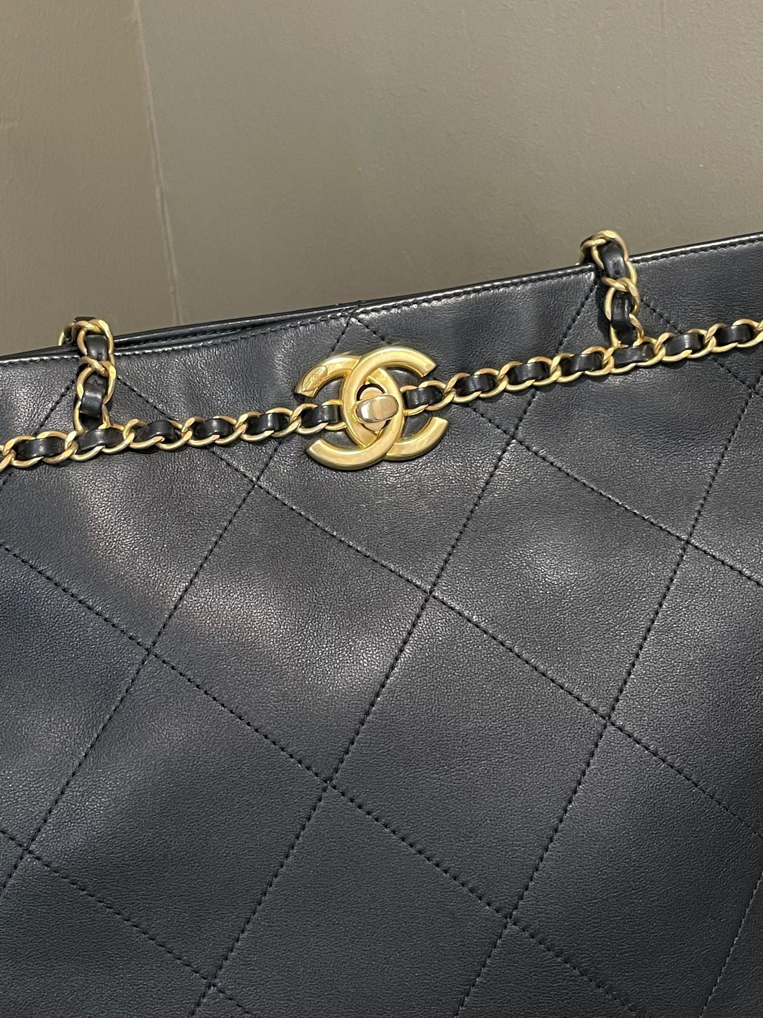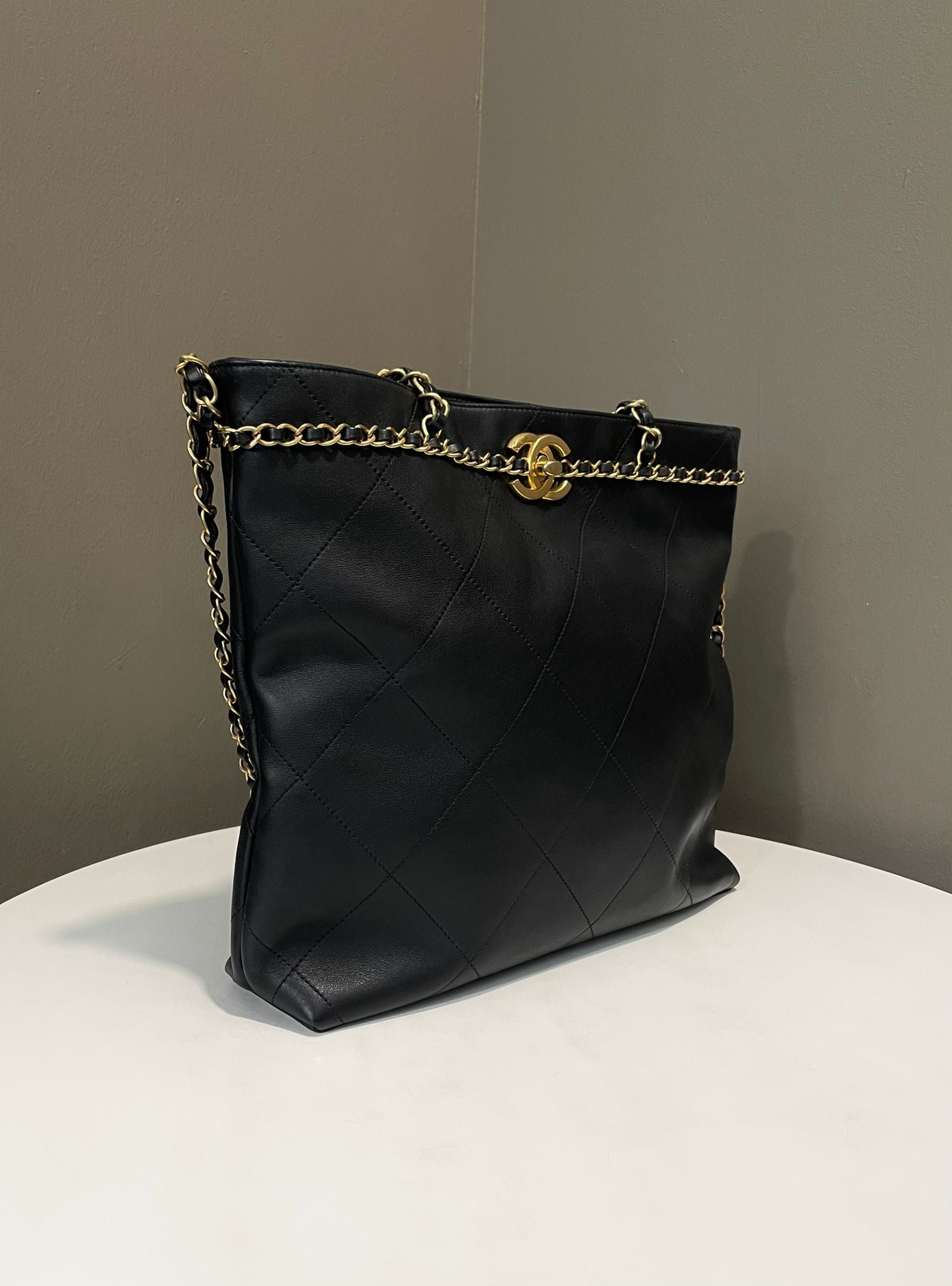 Chanel CC Lock Chain Handle Shopping Tote Black Calfskin
