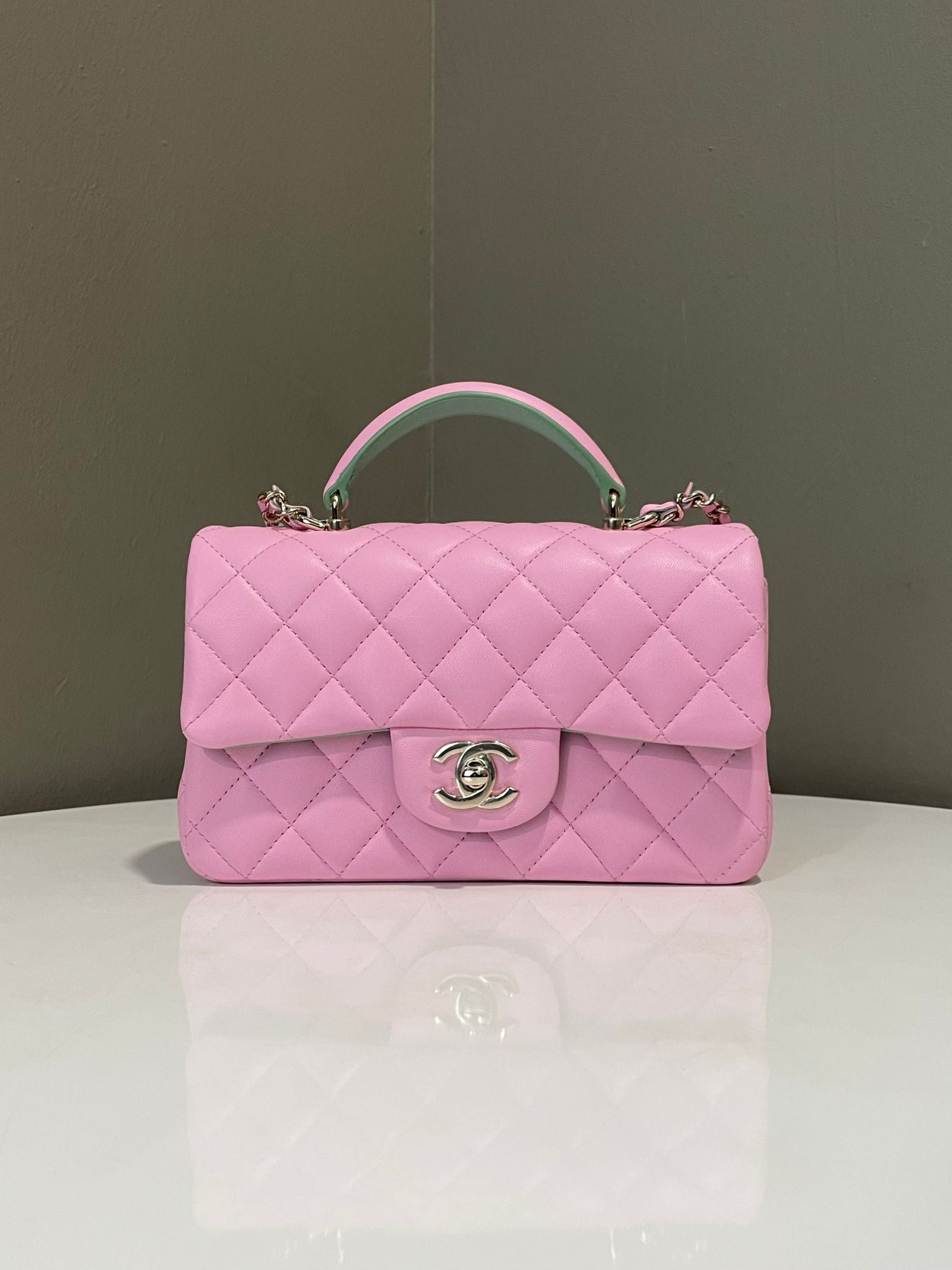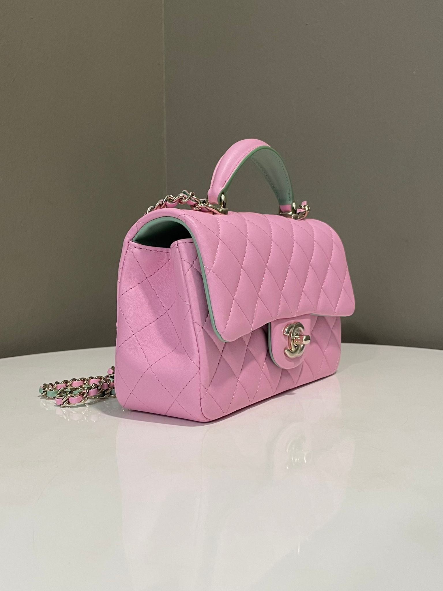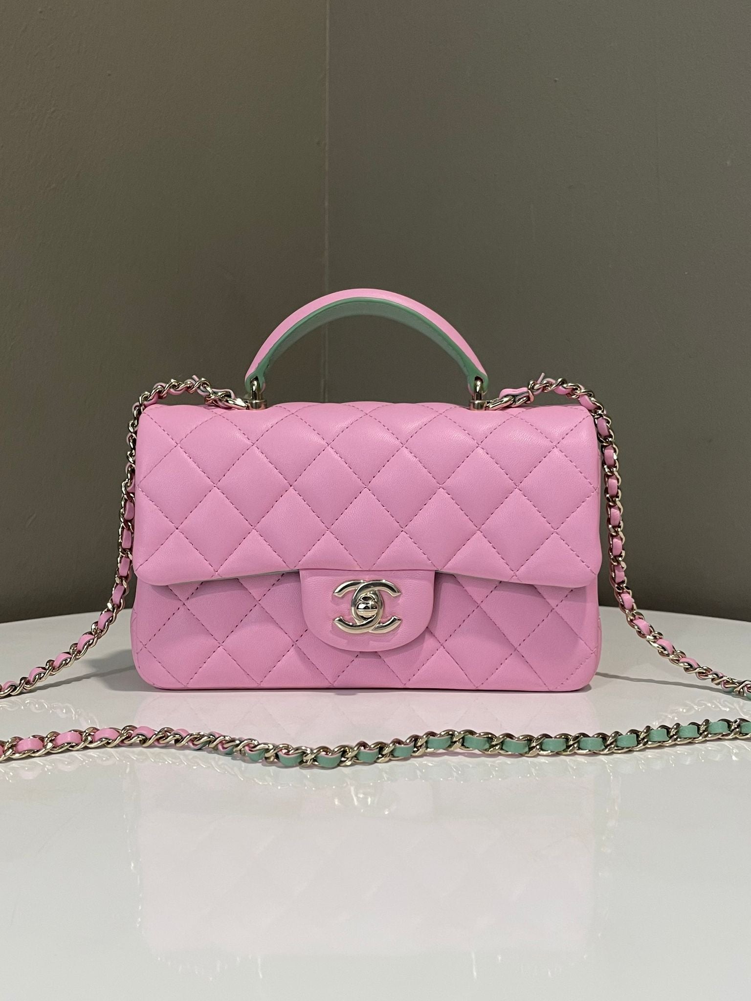 Chanel Quilted Top Handle Mini Rectangular Pink / Green Lambskin