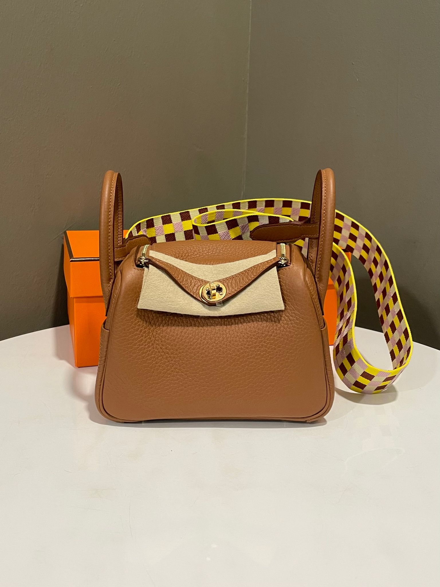 Hermes Mini Lindy Gold Clemence / Lime Quadrille