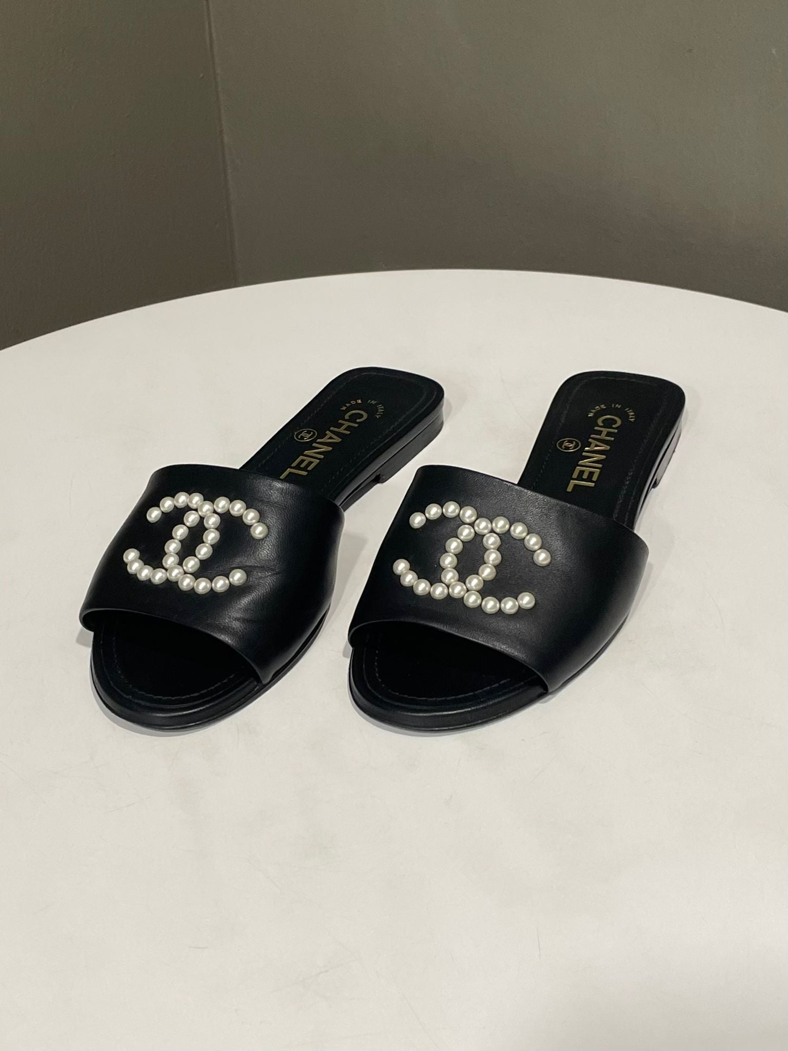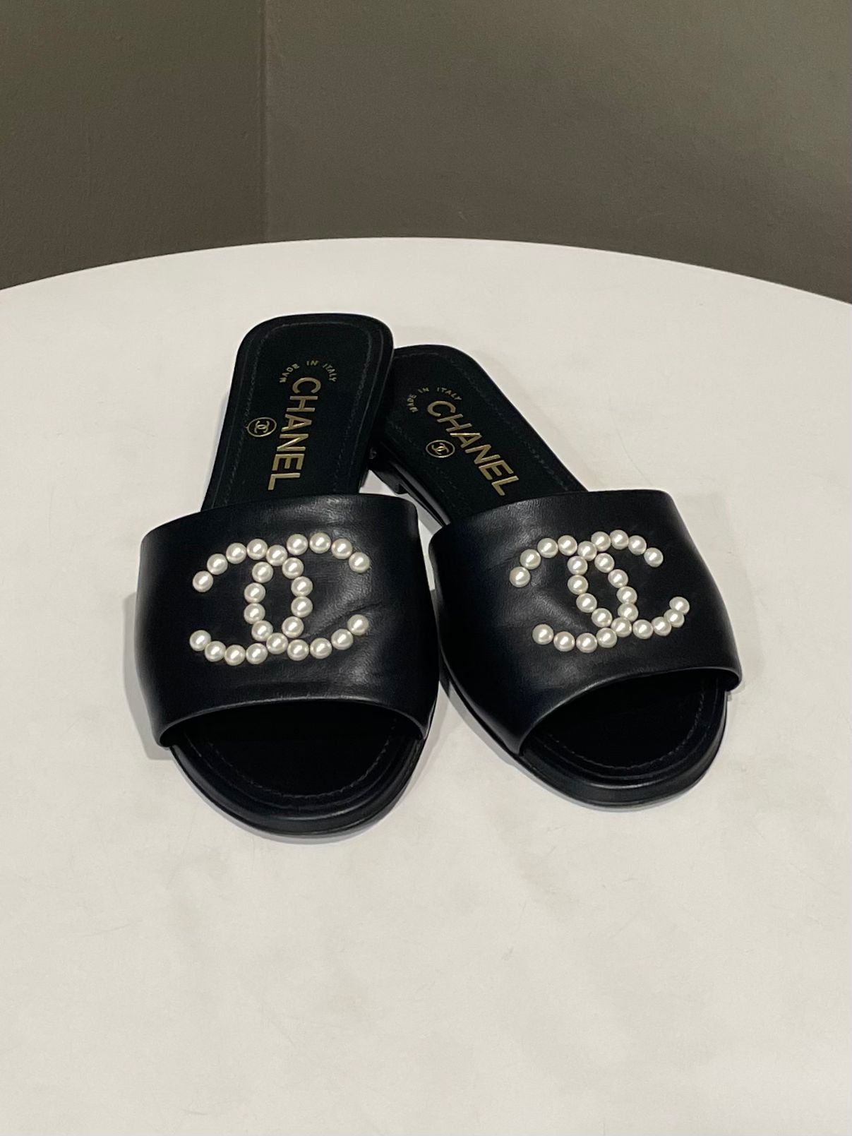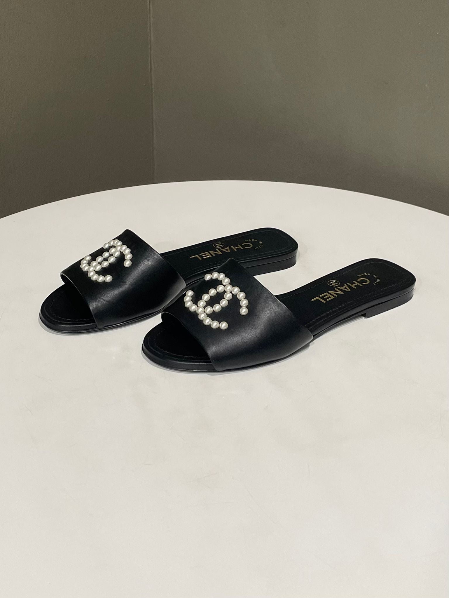 Chanel Pearl CC Flat Sandals Black / Ivory Glass Pearls Size 35
