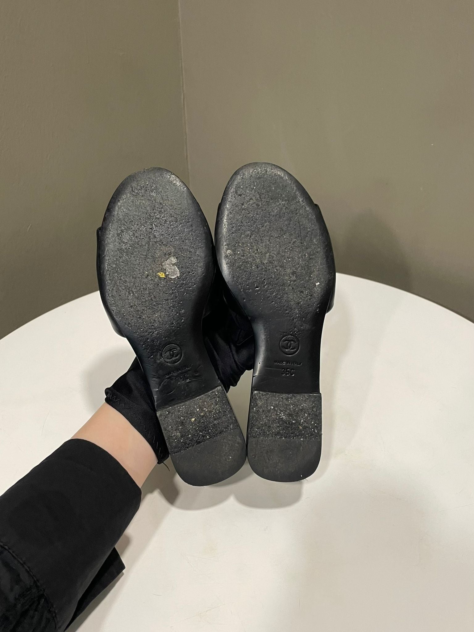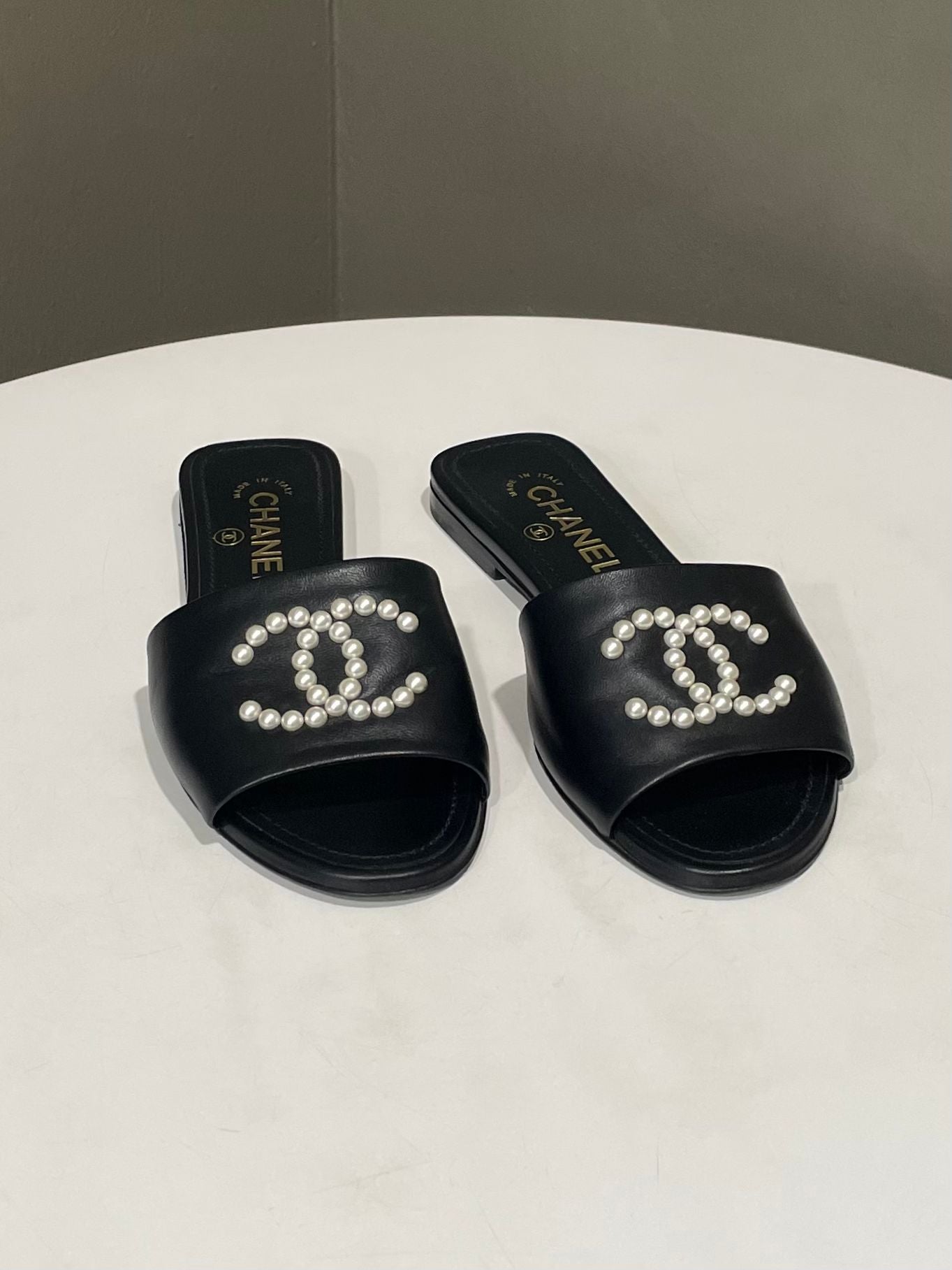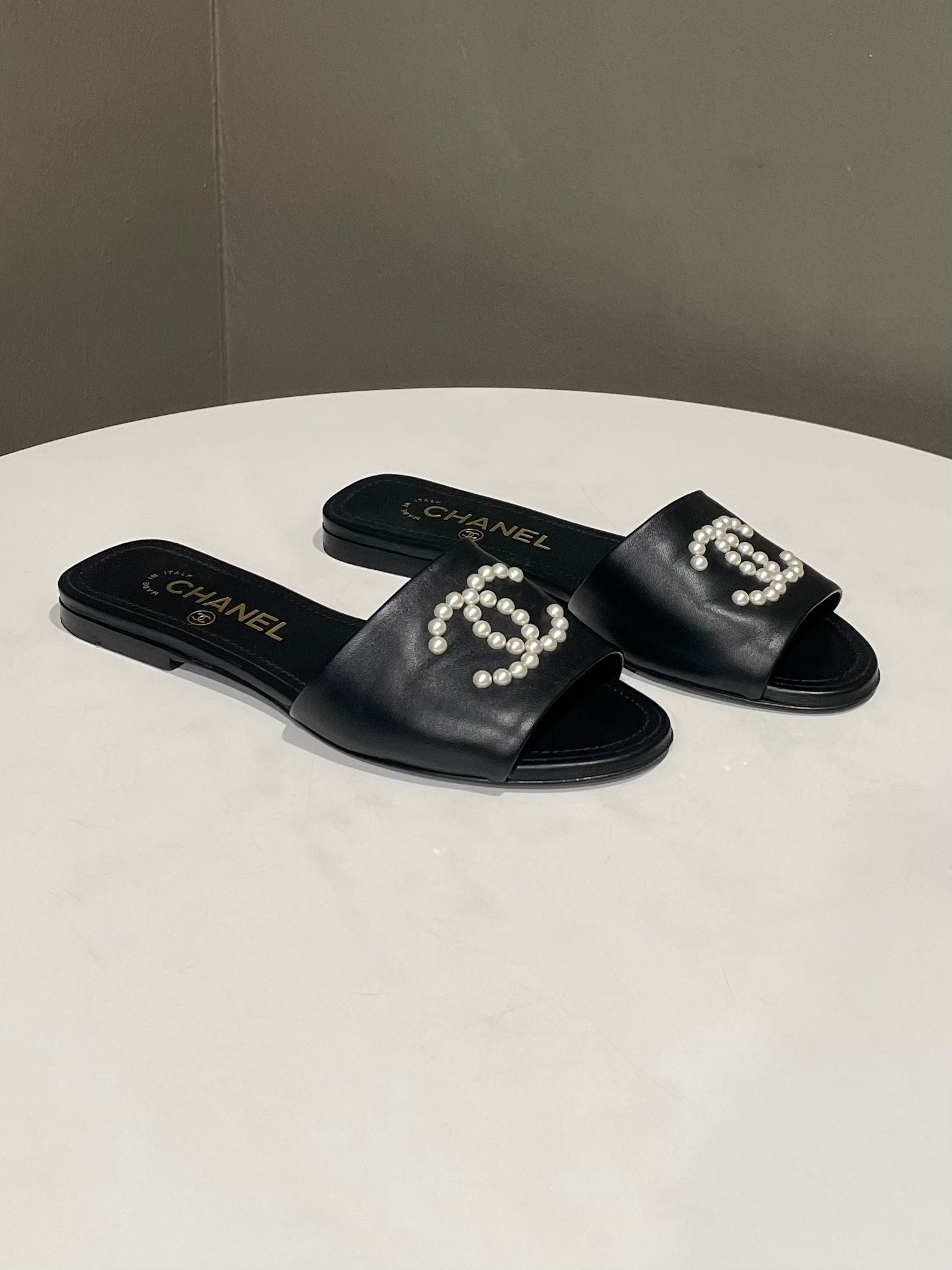 Chanel Pearl CC Flat Sandals Black / Ivory Glass Pearls Size 35