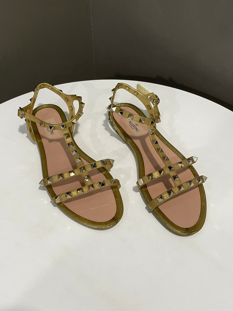 Valentino Garavani Rockstud Rubber Sandal Gold Glitter SHW Size 40