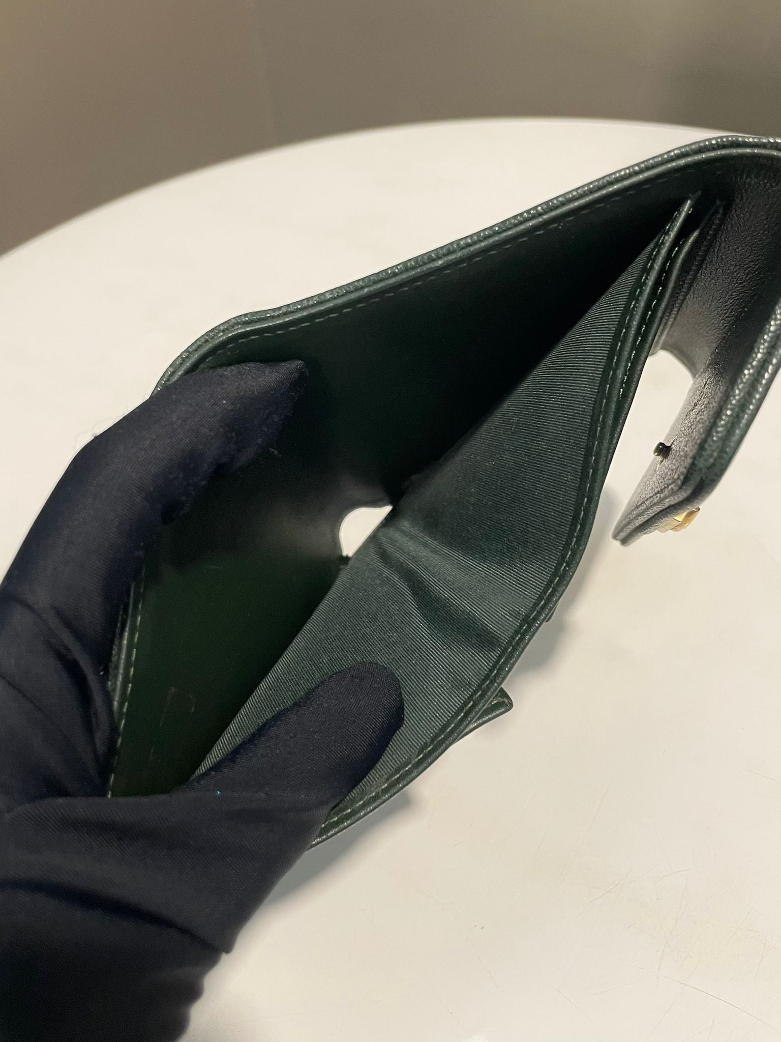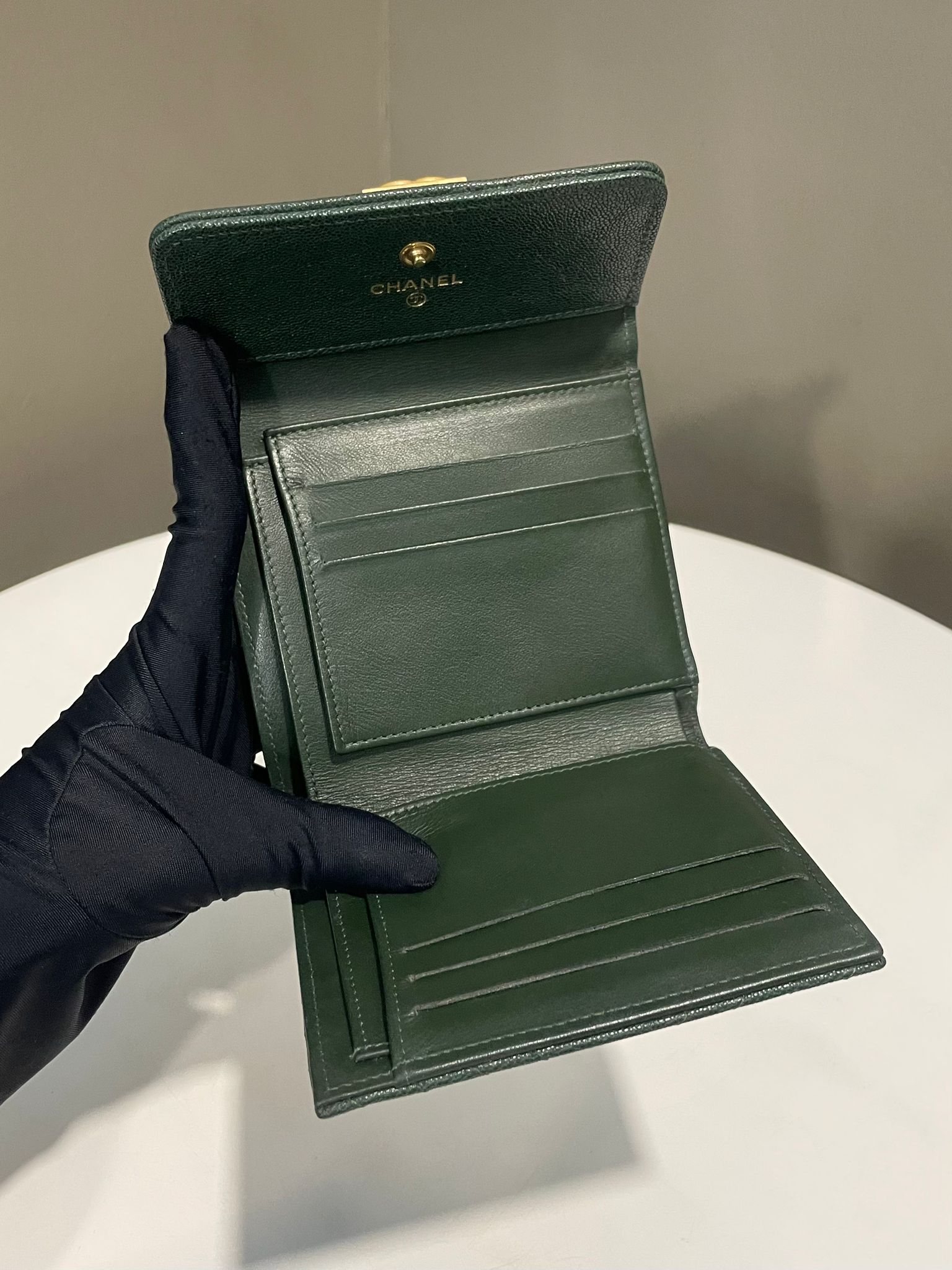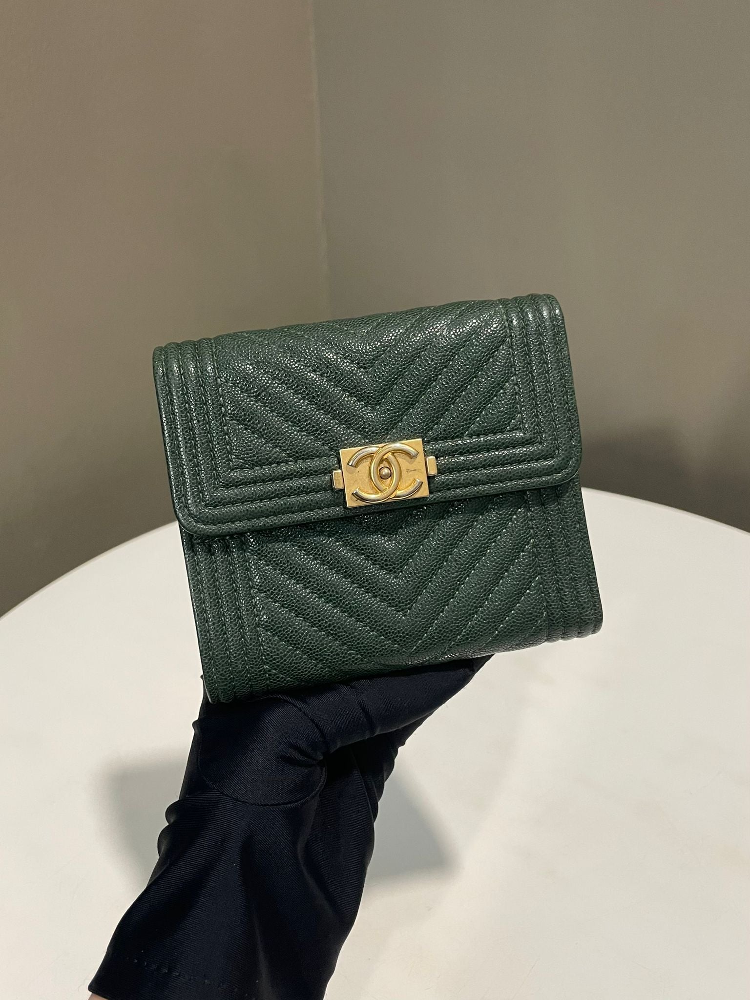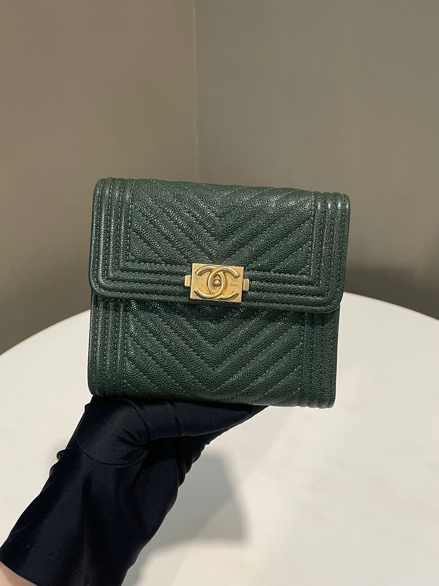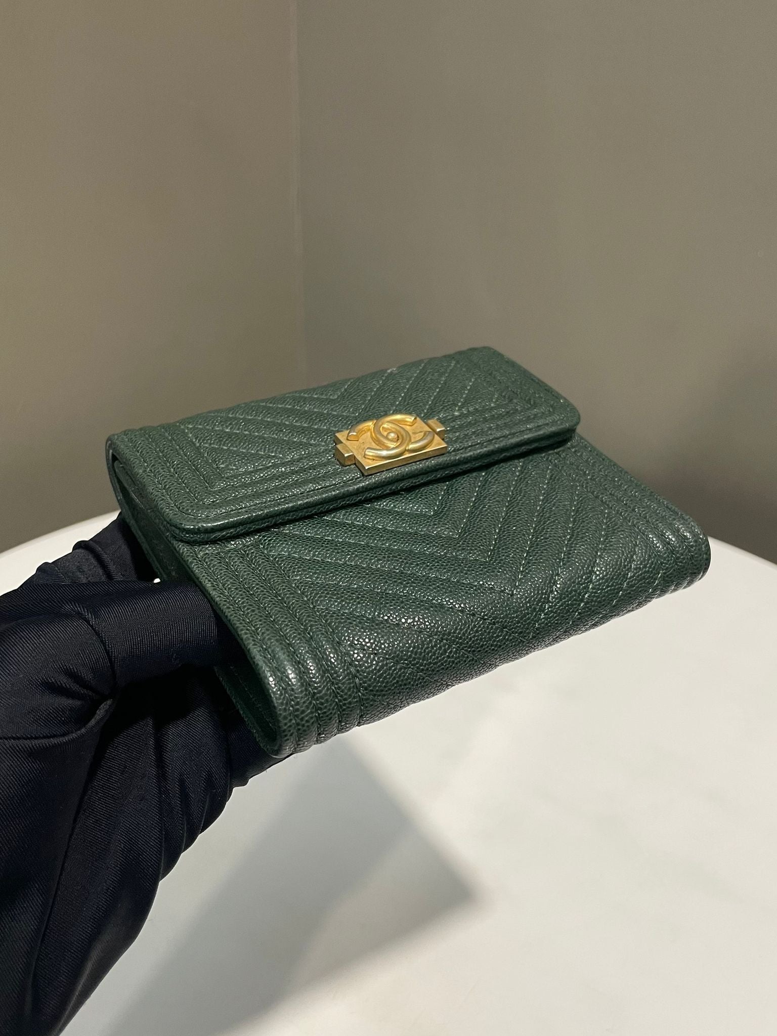 Chanel Chevron Boy Trifold Flap Wallet Green Caviar