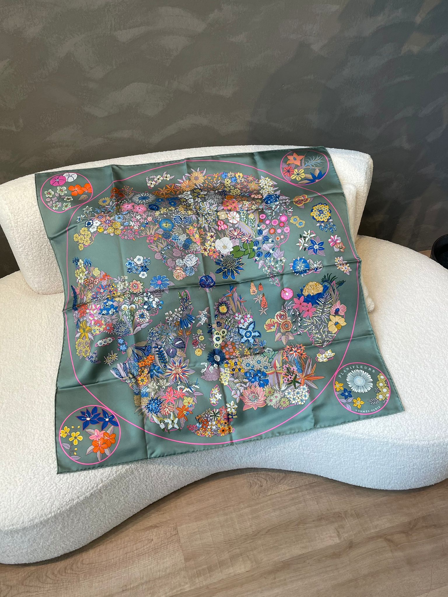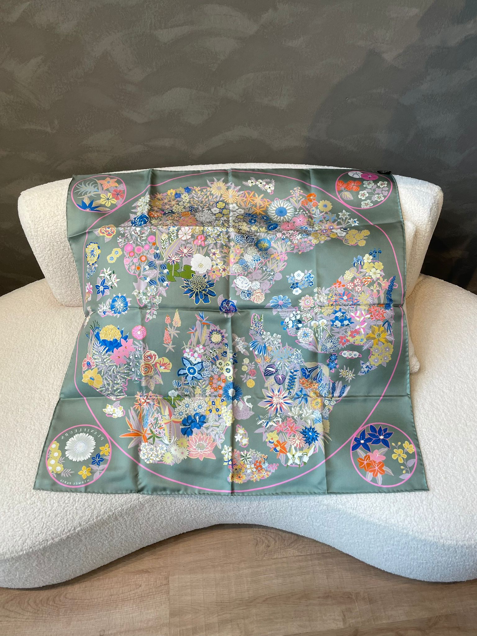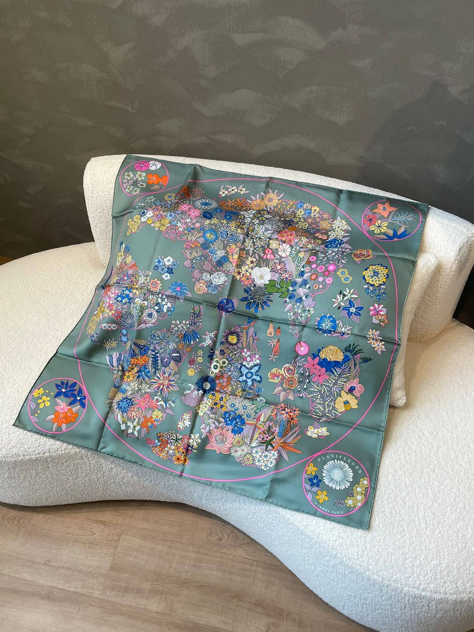 Hermes Planifleurs Scarf 90 Vert Amande / Rose / Bleu