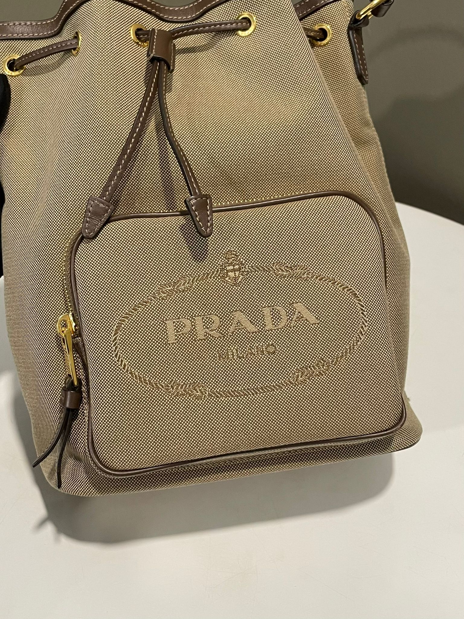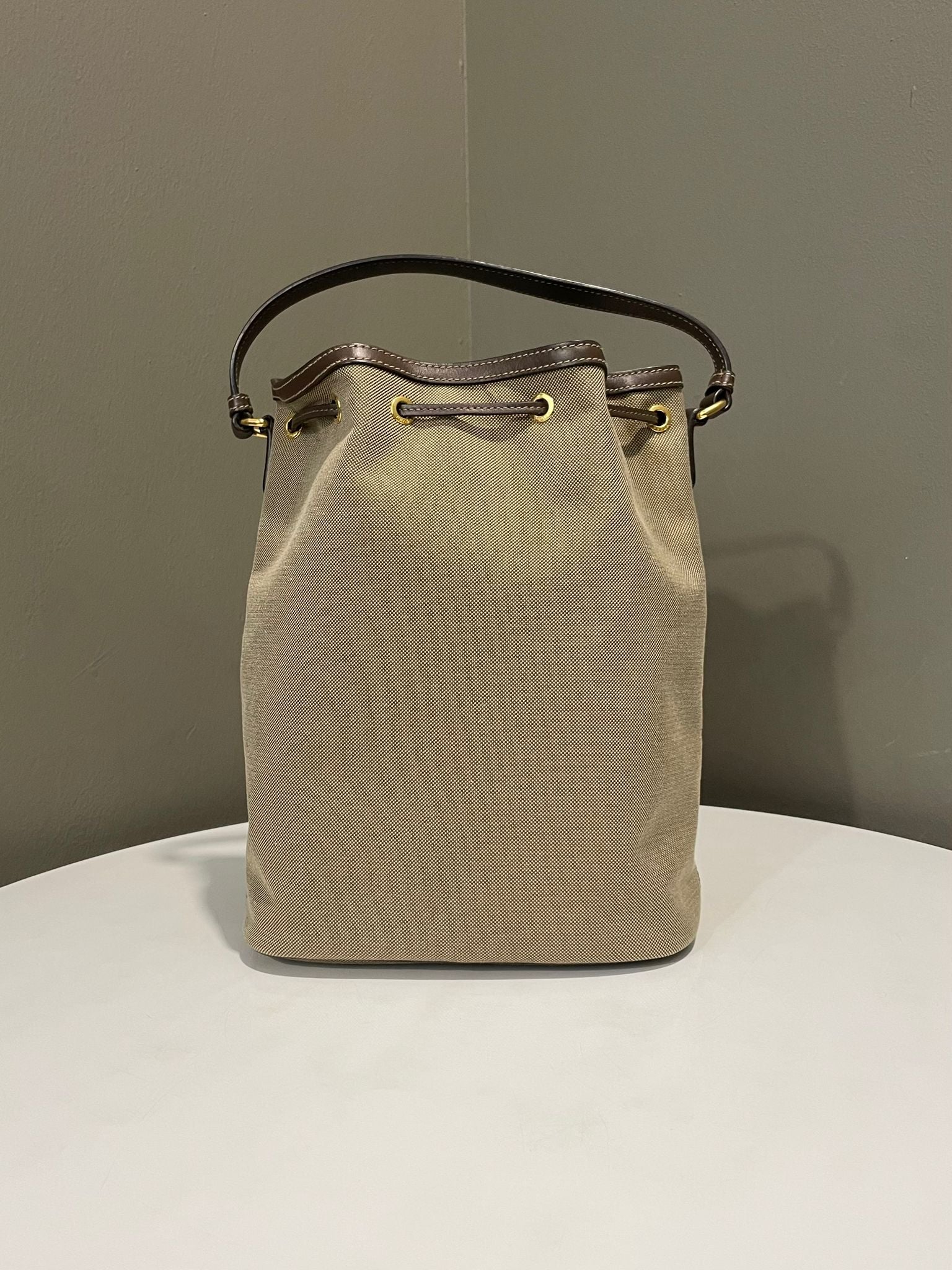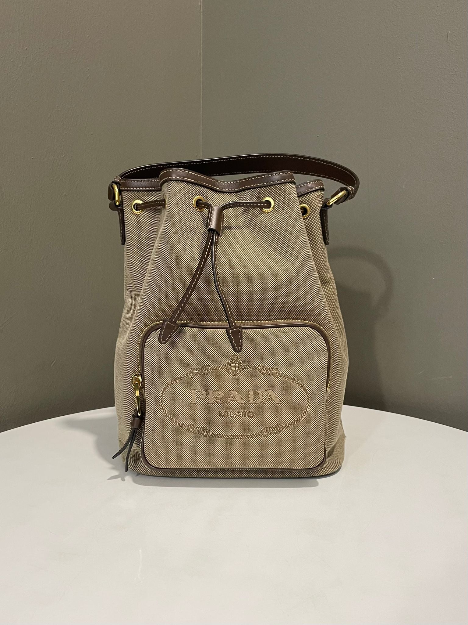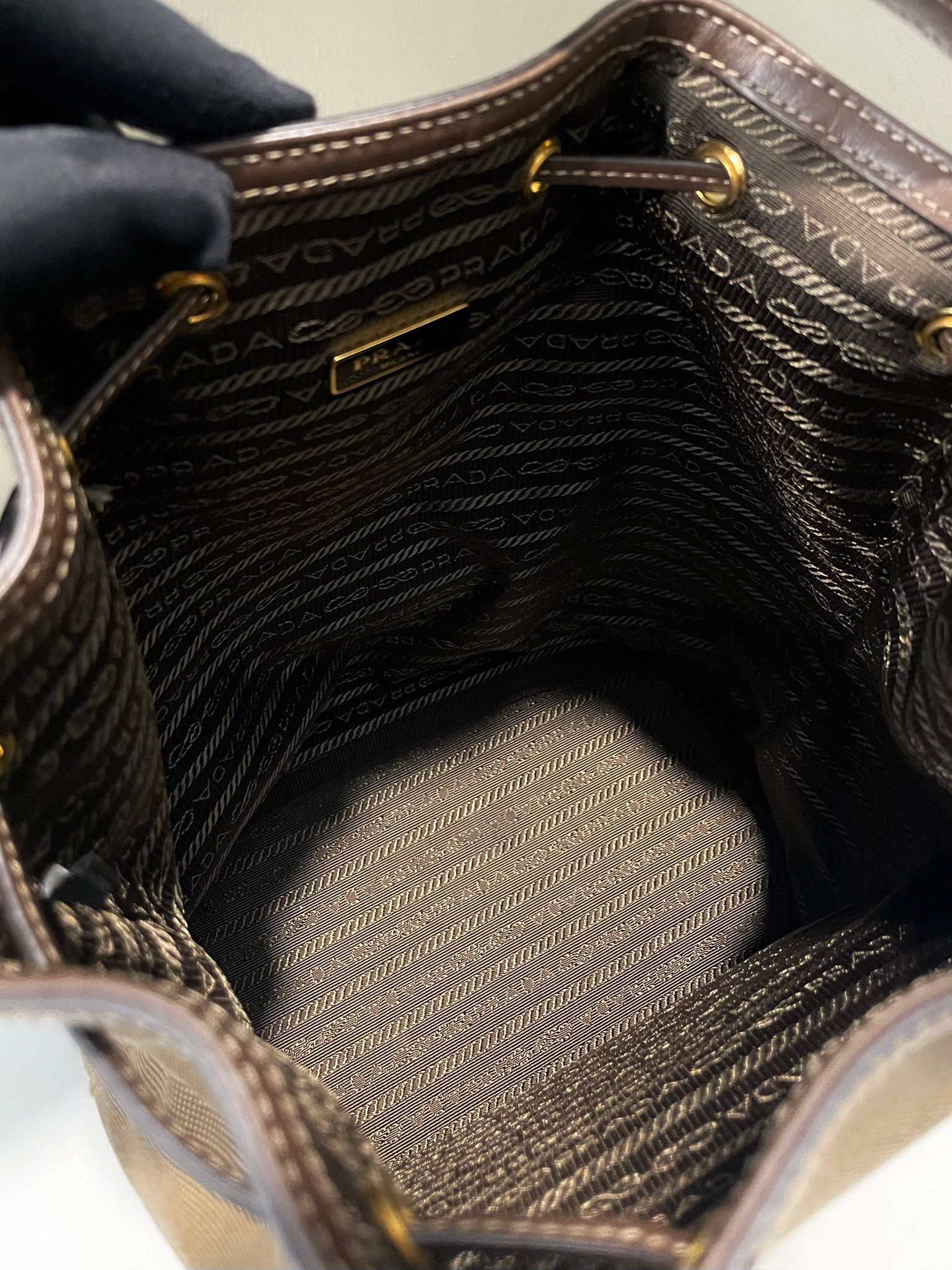Prada Drawstring Bucket Shoulder Bag Brown / Khaki / Jacquard