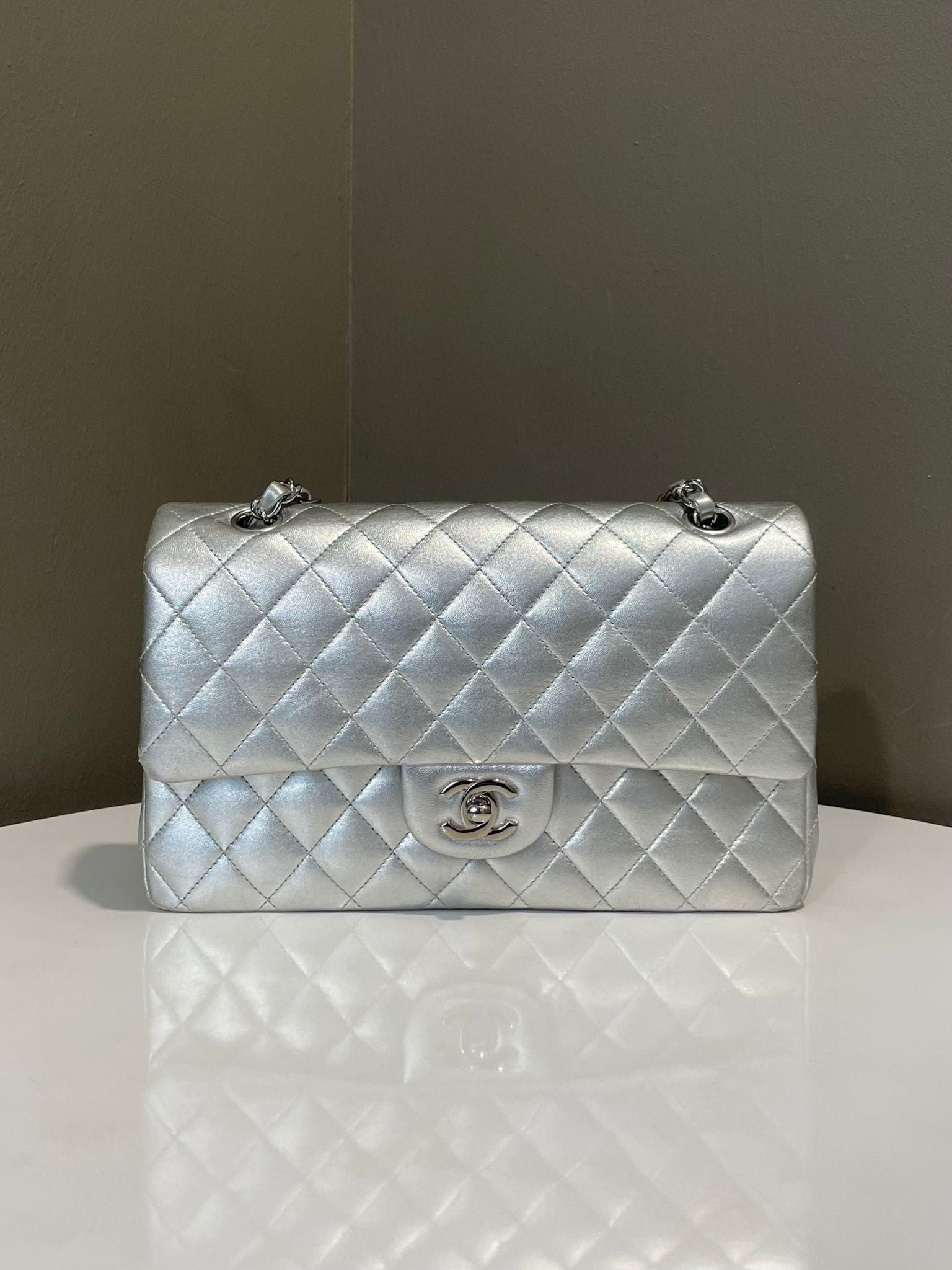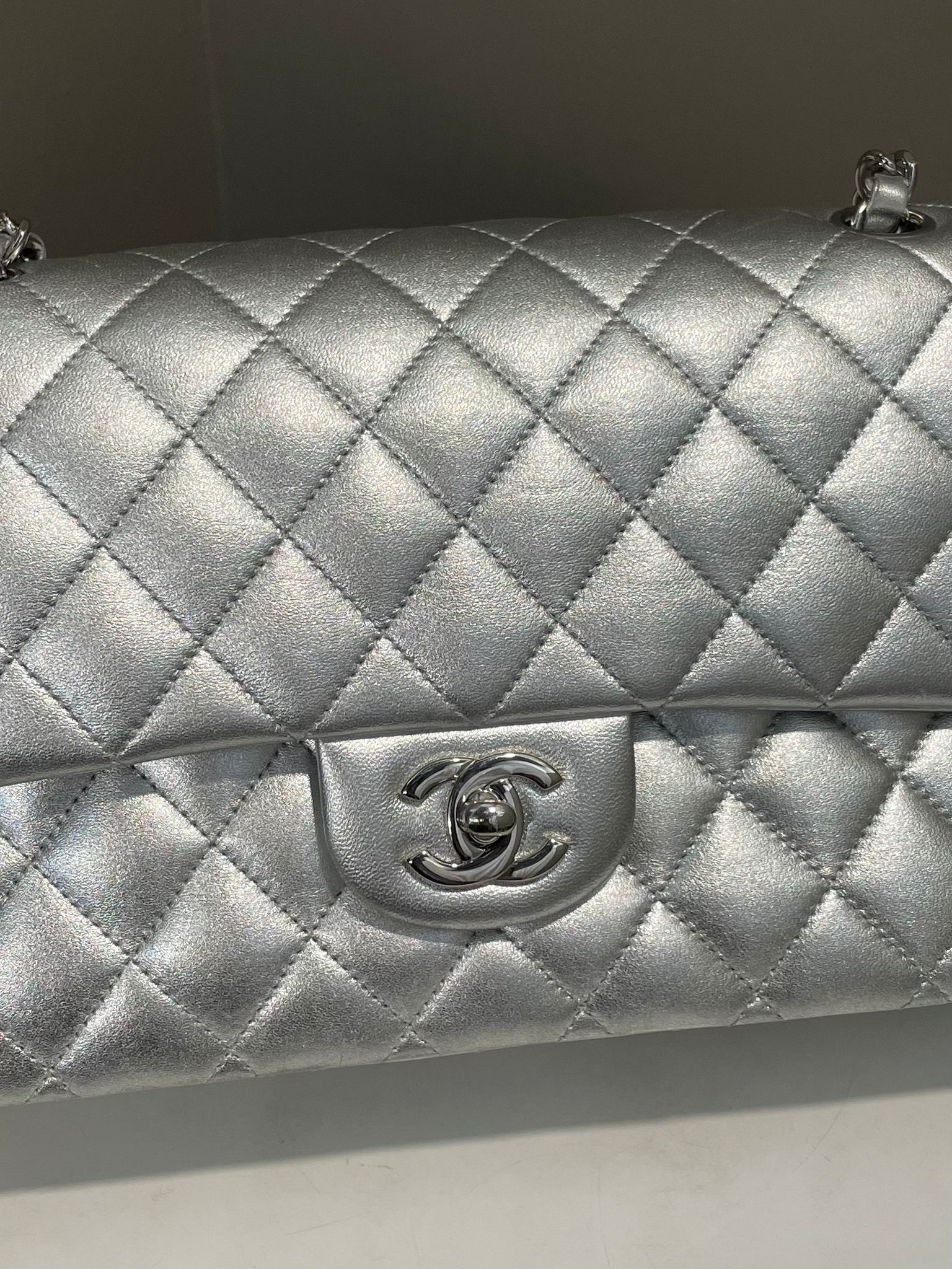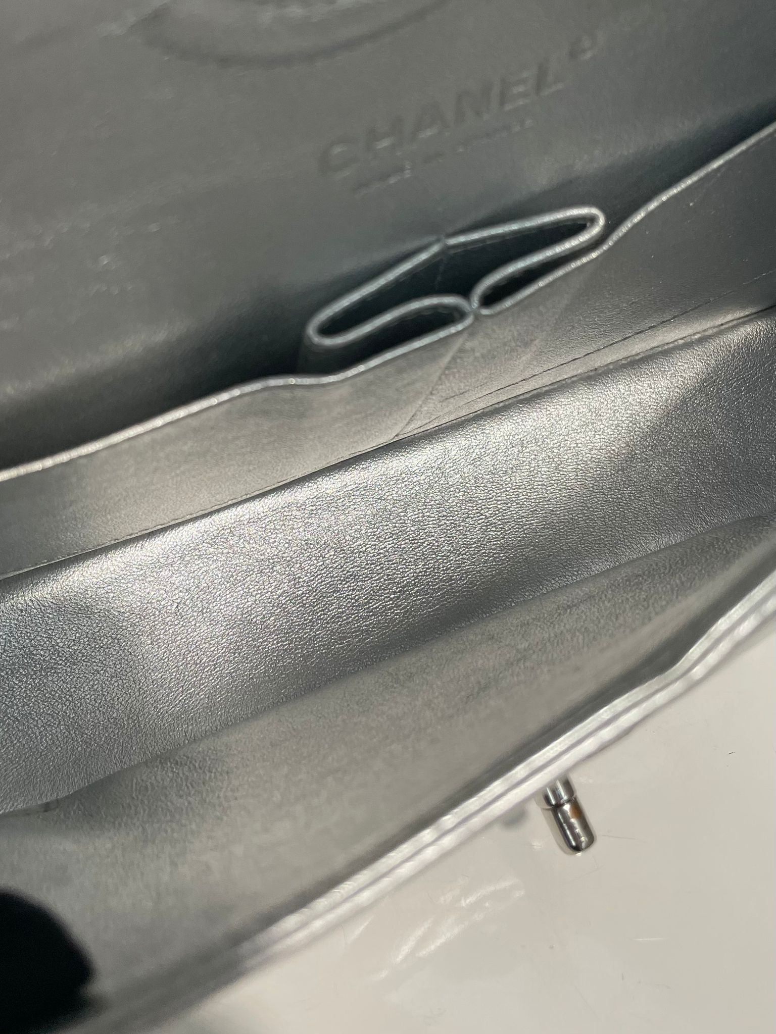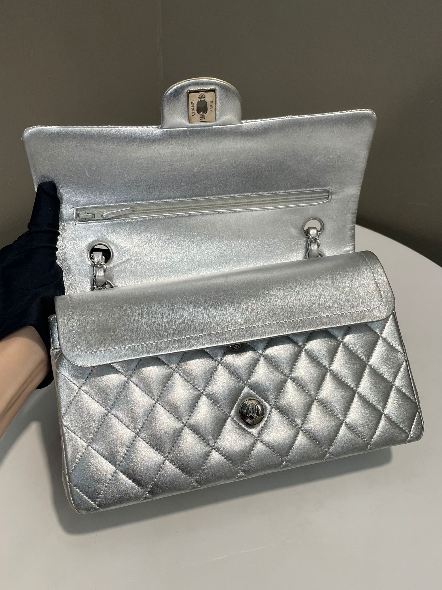 Chanel Classic Quilted Medium Double Flap Silver Lambskin